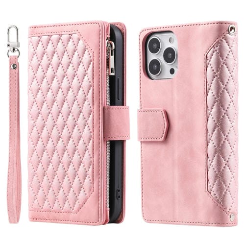 Funda de Cuero con Cremallera Textura de Cuadrícula para iPhone 16 Pro Max con Cordón (Oro Rosa)