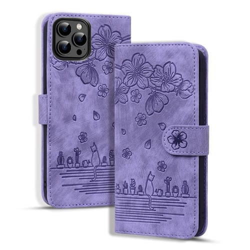 Funda de Cuero con Relieve de Gato Sakura Dibujos Animados para iPhone 16 Pro Max (Morado)