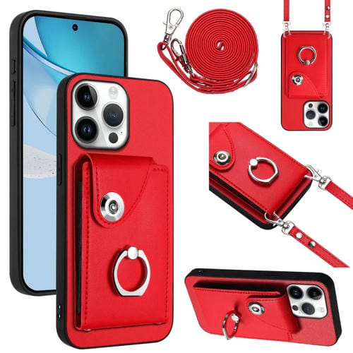 Estuche para Teléfono iPhone 16 Pro Max Soporte Tarjetas Anillo Cordón Largo (Rojo)