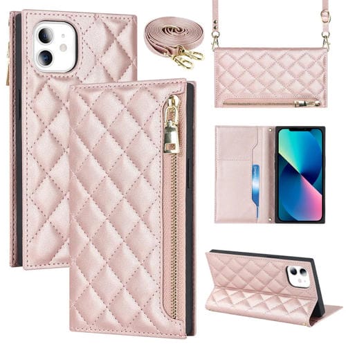 Funda de Cuero para iPhone 11 Grid Texture con Lanyard y Cremallera (Oro Rosa)