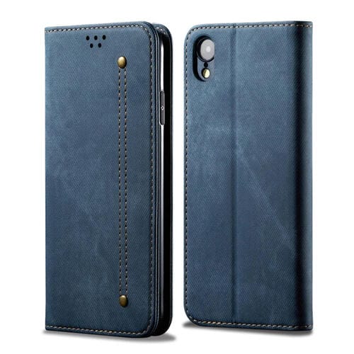 Funda para iPhone Xr Cuero Textura Mezclilla Tapa Horizontal Soporte Ranuras Tarjetas Billetera (Azul)