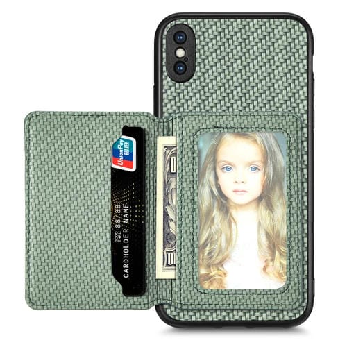 Funda de Teléfono para iPhone Xs Max con Bolsa de Tarjeta Magnética de Fibra de Carbono (Verde)