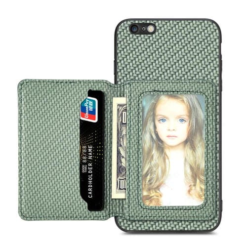 Caja de teléfono para iPhone 6 Plus 6S Plus con bolsa de tarjeta magnética de fibra de carbono (Verde)