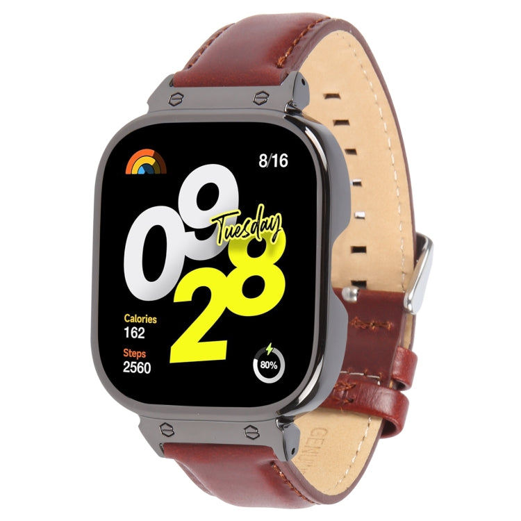 Correa de reloj de cuero genuino con marco de metal negro para Redmi Watch 4 (marrón bambú)