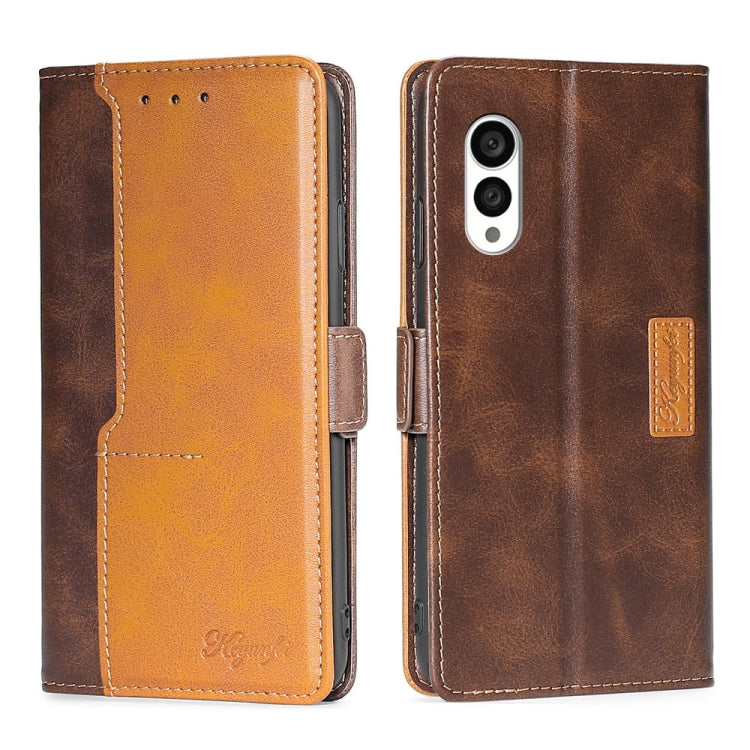Caja de Teléfono de Cuero para Fujitsu Arrows N F-51C con Hebilla Lateral (Marrón Oscuro + Dorado)
