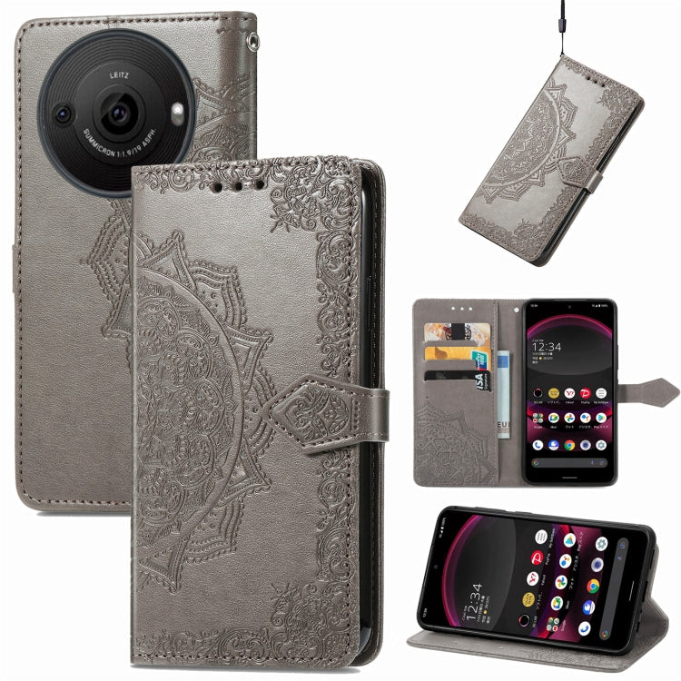 Funda de Cuero para Sharp Aquos R8 Mandala Flower en Relieve para Teléfono (Gris)
