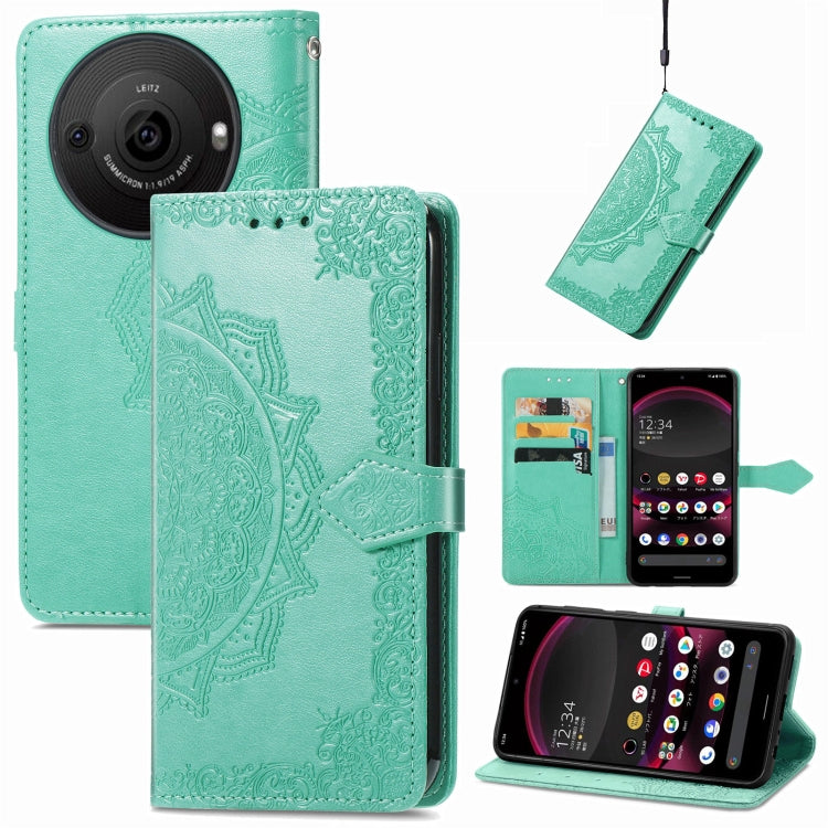 Funda de Cuero para Sharp Aquos R8 Mandala Flower en Relieve para Teléfono (Verde)
