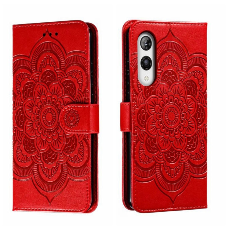 Funda de Cuero para Rakuten Hand 5G con Patrón en Relieve Sun Mandala (Rojo)
