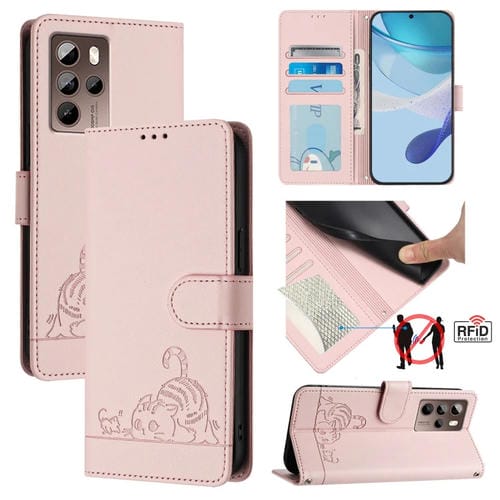 Funda para HTC U24 Pro CAT Rat de Cuero Rfid con Patrón en Relieve y Cordón (Rosa)