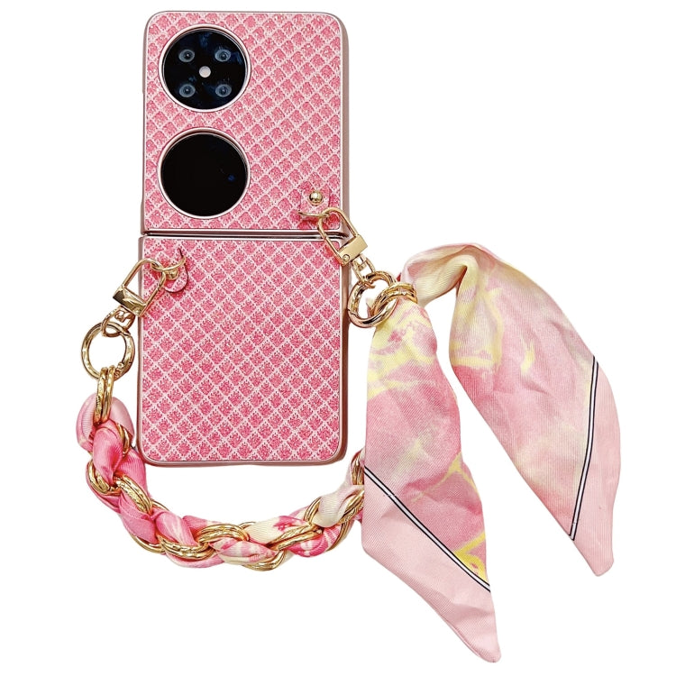 Funda para Teléfono Huawei P50 Pocket con Diamantes y Rombos para PC con Pulsera de Seda (Rosa)