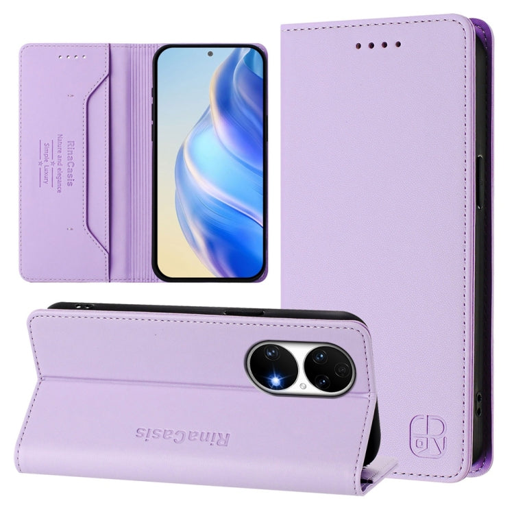 Funda de Cuero Huawei P50 Rc01 con Doble Pliegue y Succión Magnética Rfid (Morado Claro)