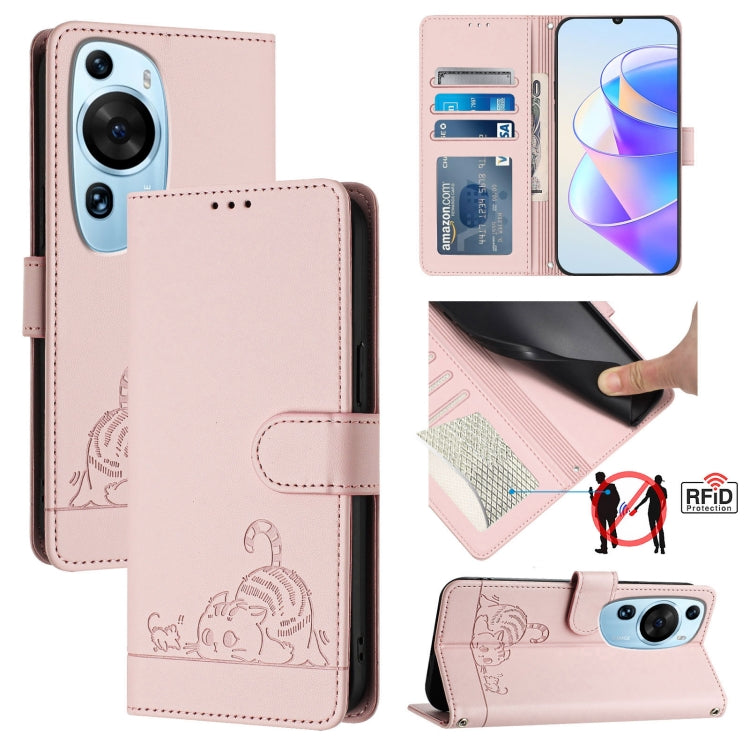Funda para Huawei Pura 70 Cat Rat de Cuero RFID con Patrón en Relieve y Cordón (Rosa)