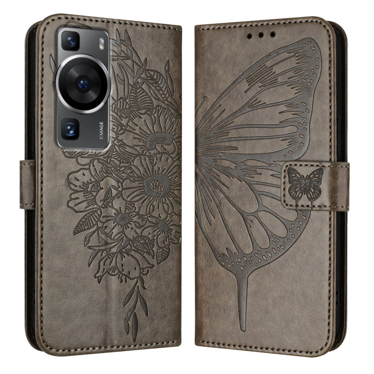 Funda de Cuero para Huawei P60 y P60 Pro con Mariposa en Relieve (Gris)