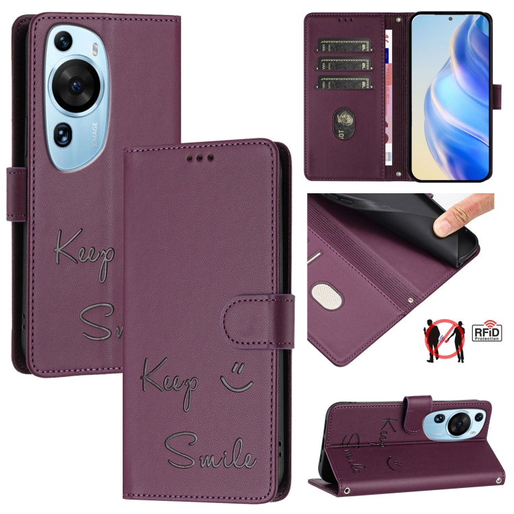 Funda de Cuero Rfid con Relieve Sonriente para Huawei Mate 60 Pro/60 Pro+ (Morado Claro)