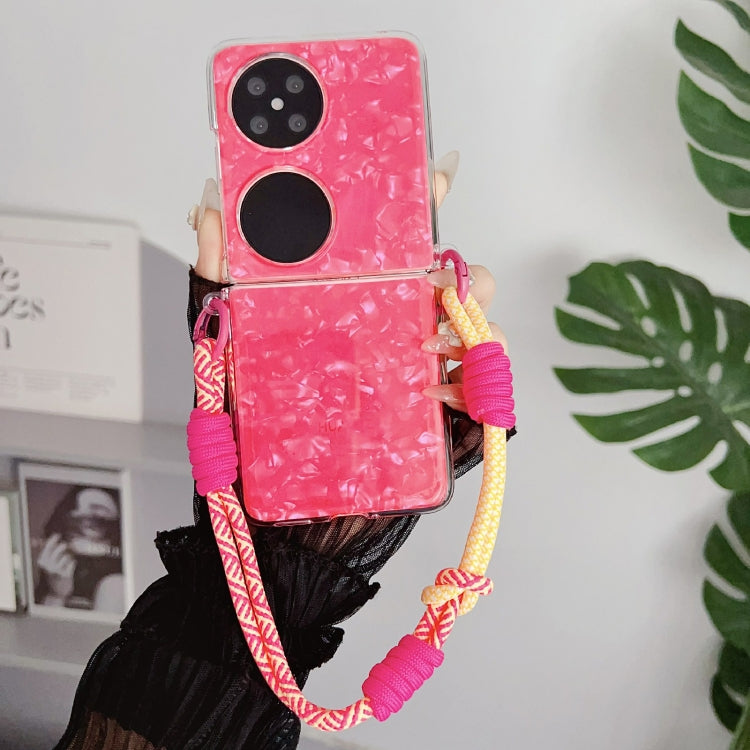 Funda para Huawei P50 con Hebilla Lateral y Textura de Concha Nacarada con Pulsera de Arcoíris (Rosa)