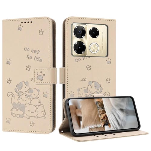 Funda de Cuero Infinix Note 40 Pro 4G/5G con Diseño de Gatito en Relieve y Cordón (Beige)