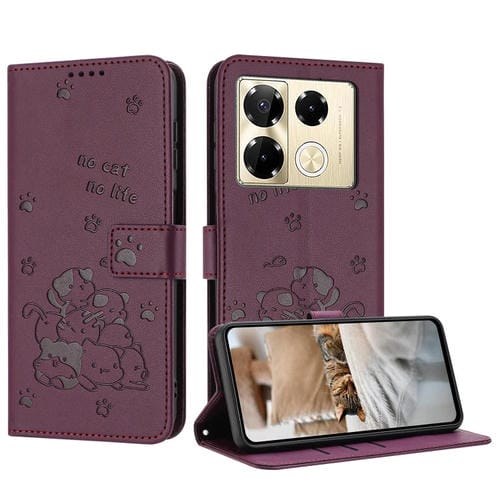 Funda de Cuero Infinix Zero 40 4G/5G con Diseño de Gatito y Cordón (Rojo Vino)