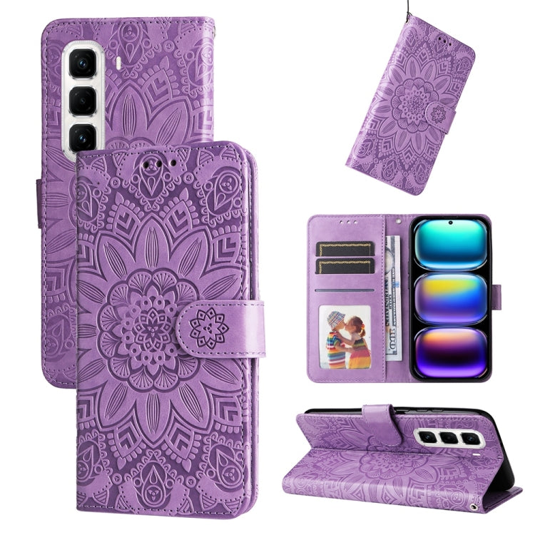 Funda de Cuero con Estampado de Girasoles En Relieve para Infinix Hot 50 Pro+ 4G (Morado)