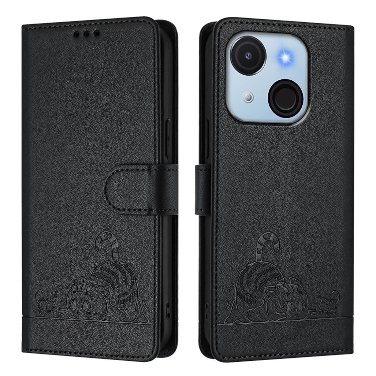 Funda de Cuero Rfid para Teléfono Itel A50C con Estampado de Rata y Gato y Cordón (Negro)