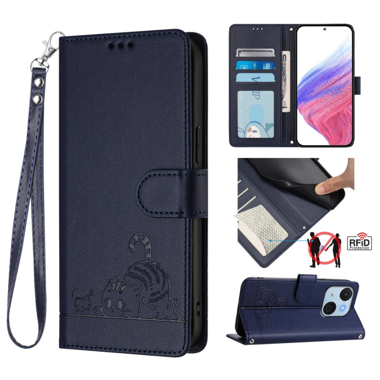 Funda de Cuero Rfid para Teléfono Itel A80 4G con Estampado de Rata y Gato y Cordón (Azul)
