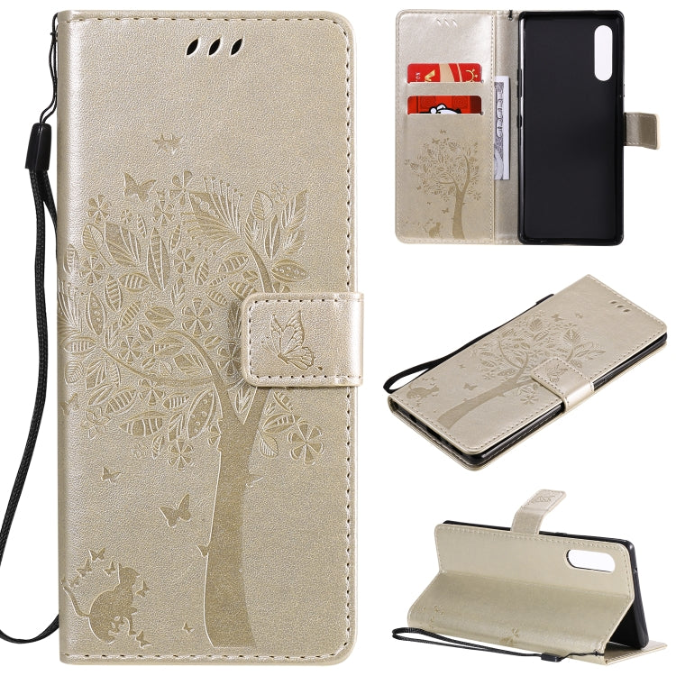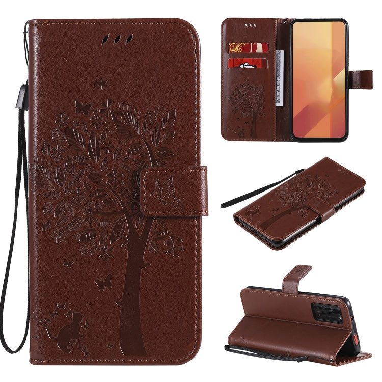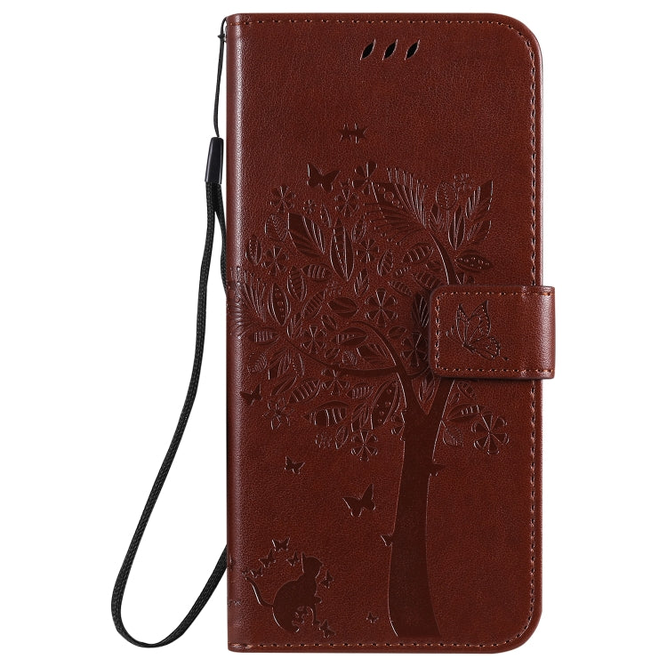 Funda de Cuero para LG K50S con Tapa Horizontal, Patrón Árbol y Gato, Soporte, Ranuras y Cordón (Café)