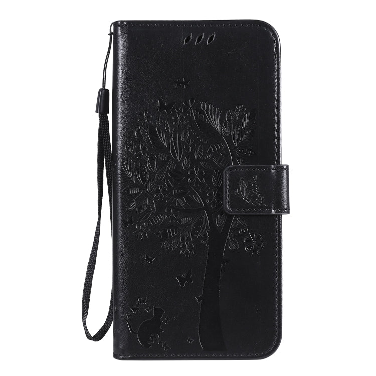 Funda de Cuero para LG K51 con Tapa Horizontal, Patrón Árbol y Gato, Soporte, Ranuras y Cordón (Púrpura)