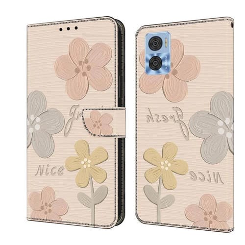 Funda de Cuero Pintada a Mano para Motorola Moto E22 (Flores Beige)