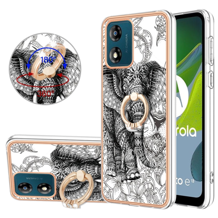 For Motorola Moto E13 Electroplating Double-sided IMD Phone Case with Ring Holder (Totem Elephant)