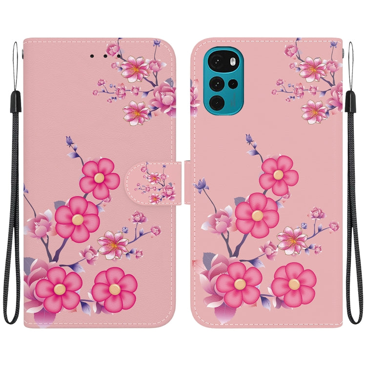 Estuche de Cuero para Motorola Moto G22 con Dibujo Coloreado y Textura de Cristal (Flores de Cerezo)