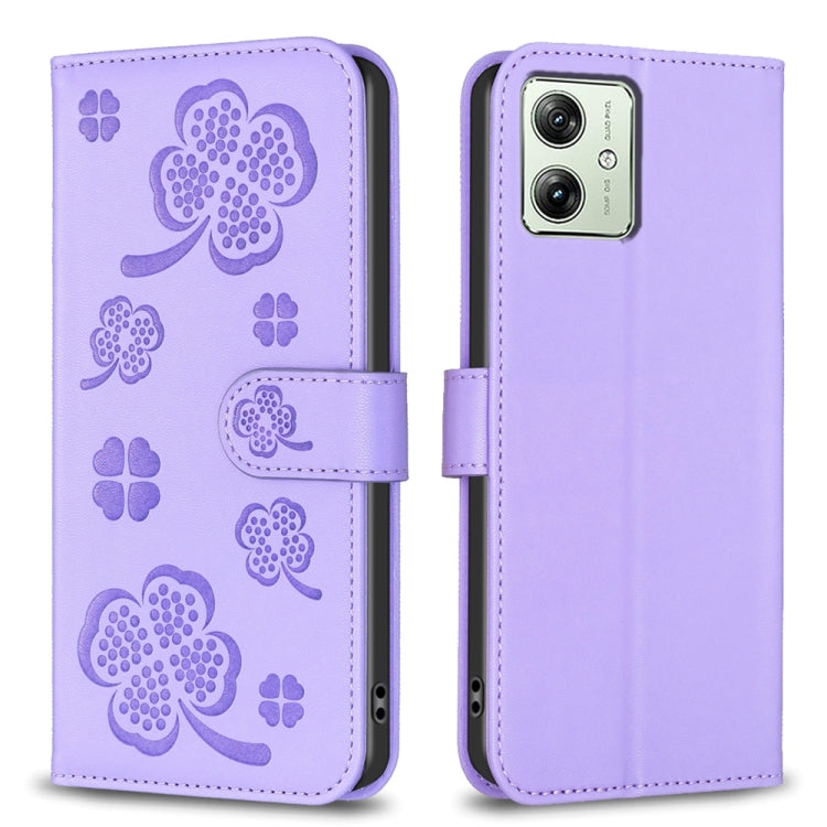 Funda para Motorola Moto G54 5G Eu Edition de Cuero con Relieve de Cuatro Hojas (Púrpura)