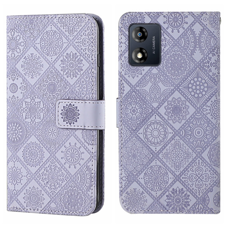 Funda de Cuero para Motorola Moto E13 con Patrón en Relieve Estilo Étnico (Púrpura)