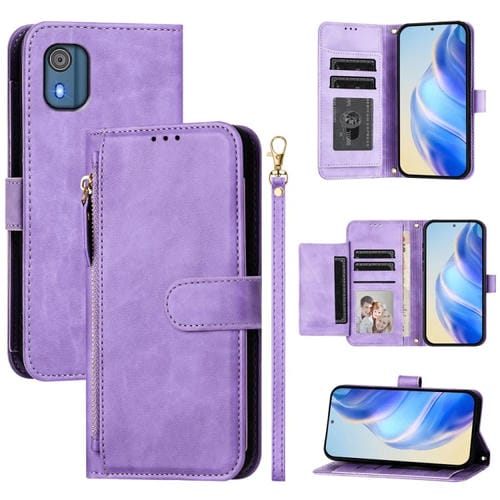 Funda de Cuero Tipo Billetera para Nokia C02 con Cremallera y Ranuras para Tarjetas (Morado)