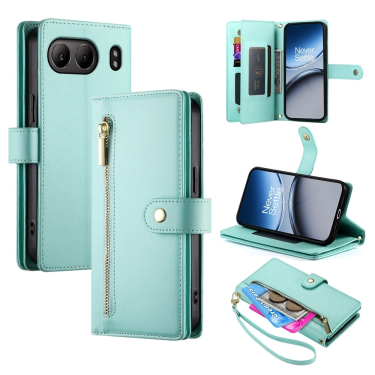Funda de Cuero para OnePlus Nord 4 5G con 9 Ranuras para Tarjetas y Cremallera (Verde Menta)