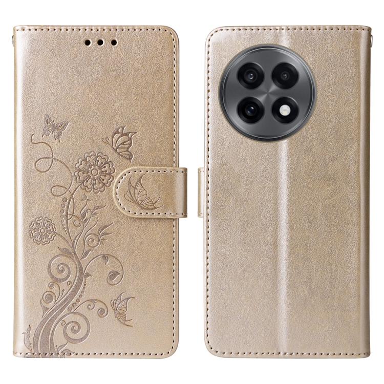 Funda de Cuero para OnePlus 13R/Ace 5/Ace 5 Pro con Diseño de Mariposas y Flores en Relieve (Dorada)