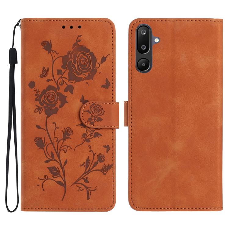 Funda de cuero con estampado de rosas en relieve para Samsung Galaxy F16 (marrón)