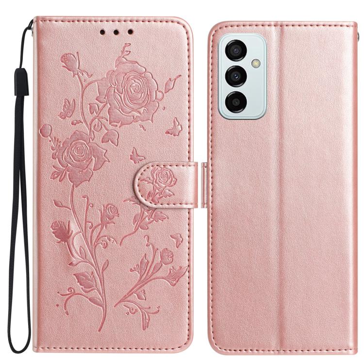 Funda de cuero con estampado floral en relieve para Samsung Galaxy M23 (oro rosa)