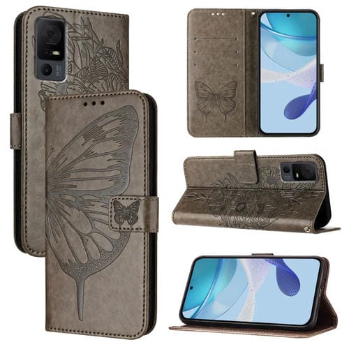Funda de Cuero para TCL 30T T603Dl con Diseño de Mariposa En Relieve (Gris)