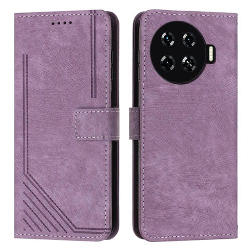 Funda de Cuero para Tecno Spark 20+ con Patrón de Rayas y Cordón Largo (Púrpura)