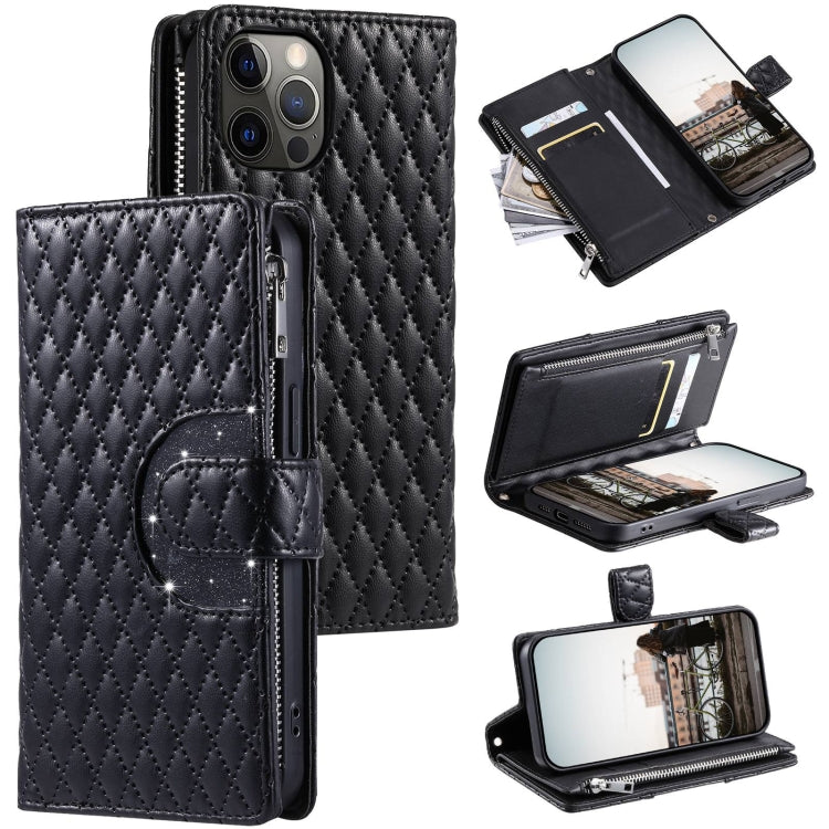 Funda para teléfono iPhone 11 Pro Max Glitter Lattice Zipper Wallet de Cuero (Negro)
