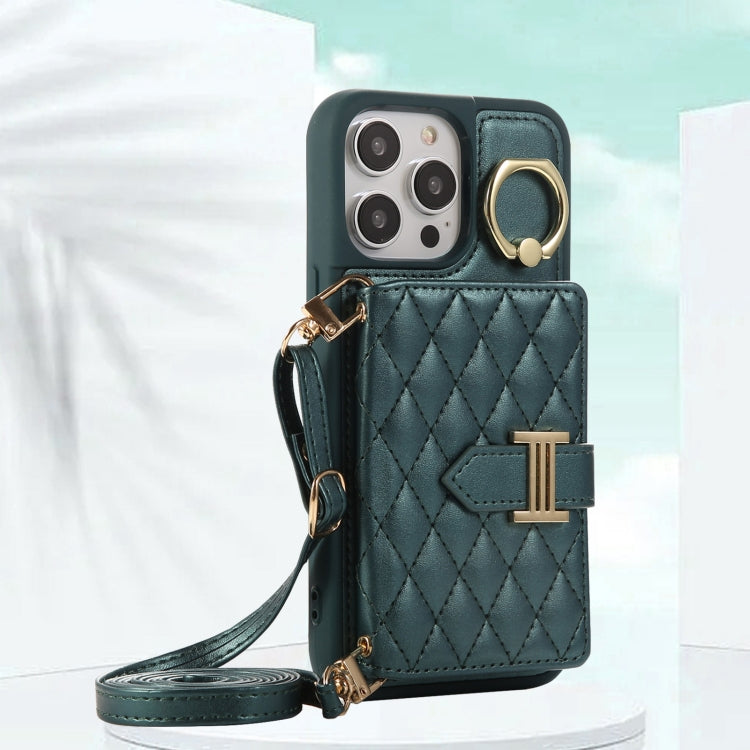 Funda para iPhone 11 Pro Max Horizontal Card Bag Ring Holder con Doble Cordón (Verde Oscuro)