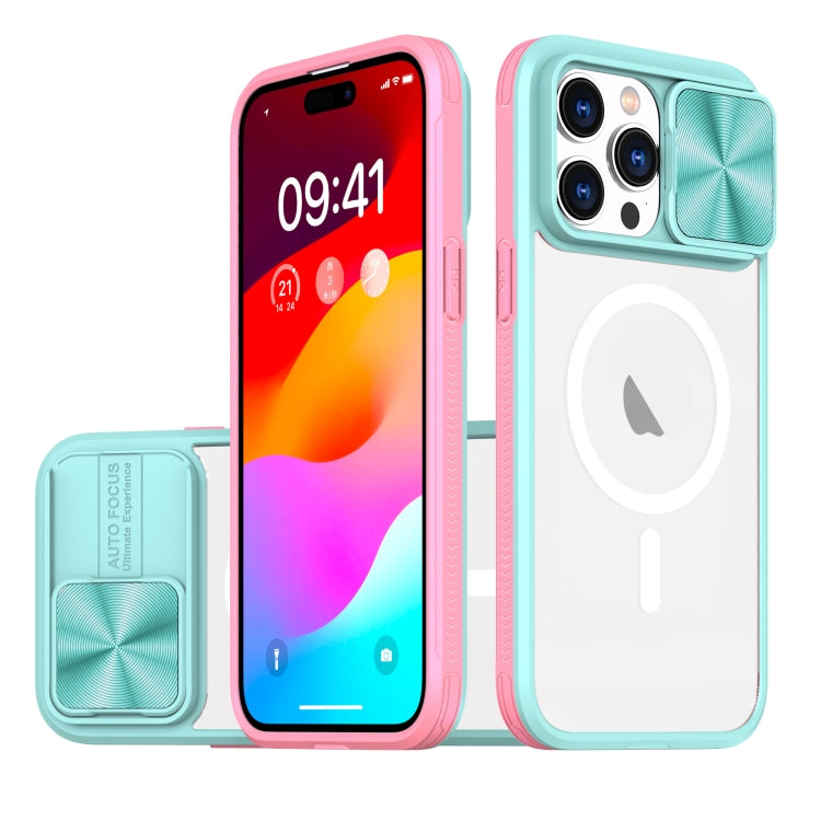 Funda para iPhone 12 Pro Max Cubierta Deslizante AcrĂlico Transparente PC TPU Magsafe (Rosa + Cian)