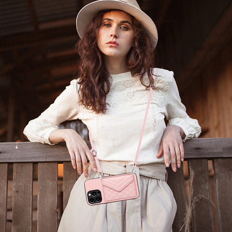 For iPhone 13 Pro RFID Phone Case with Rhombic Texture Card Pouch and Long Lanyard (Rose Gold)
