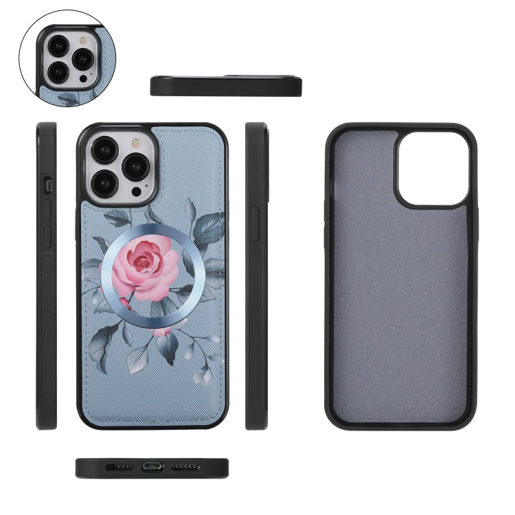 For iPhone 13 Pro MagSafe Flower Leather Phone Case Multifunctional Zipper Crossbody Wallet Case (Blue)