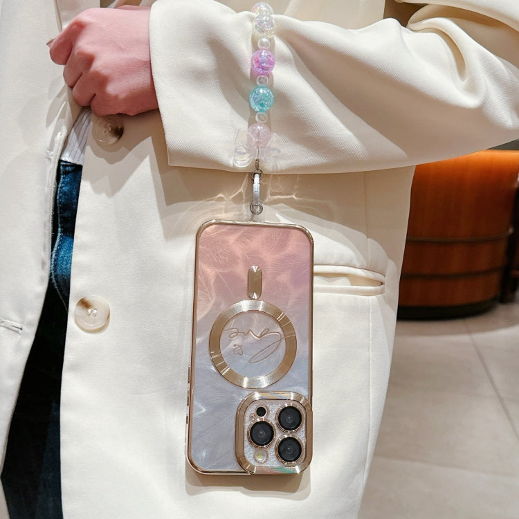 Funda para teléfono iPhone 14 Pro Max Dual-Love Feather Gradient Glitter Pulseras Magsafe TPU (Oro)