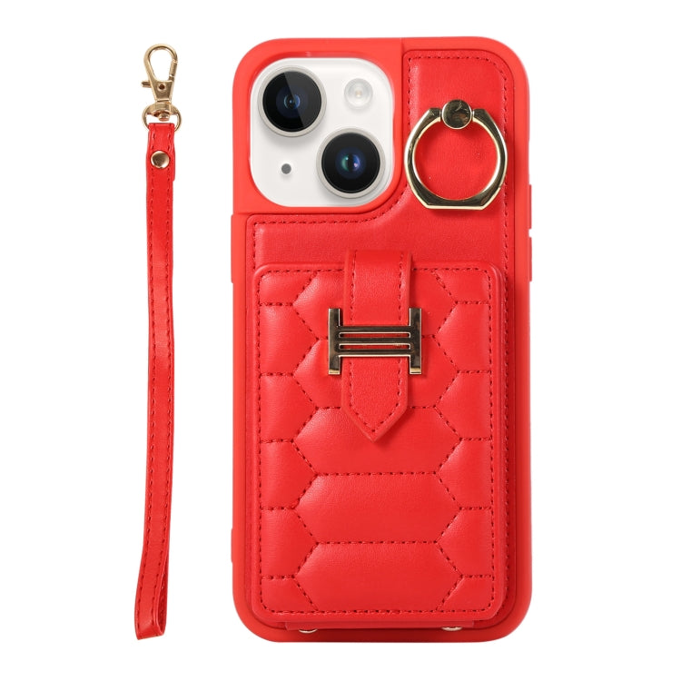 Funda para iPhone 14 Vertical Card Bag Ring Holder con Doble Cordón (Rojo)