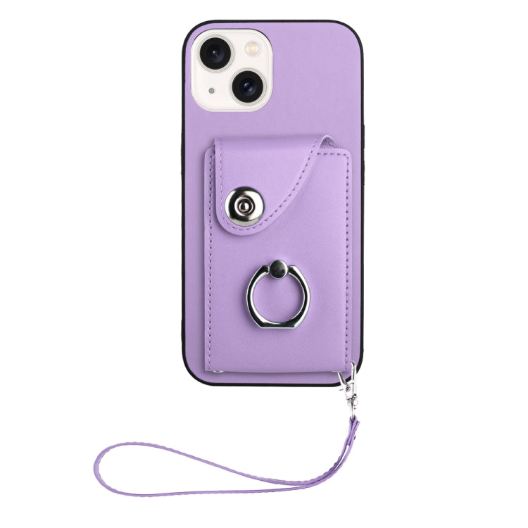 Funda para Teléfono iPhone 14 de PU con Soporte para Anillo y Bolsa para Tarjeta con Cordón (Púrpura)