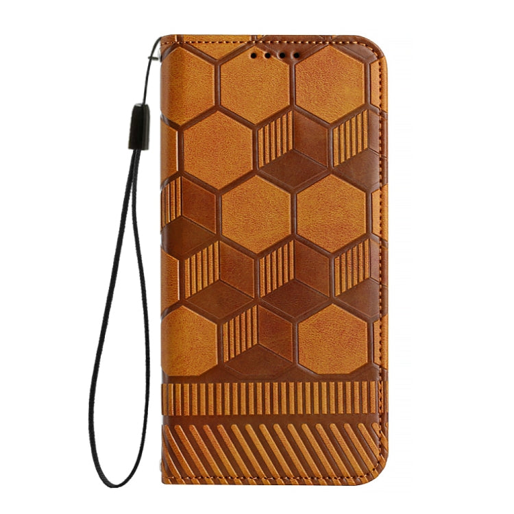 Funda de teléfono iPhone 14 con tapa de cuero magnético textura de fútbol (Marrón)