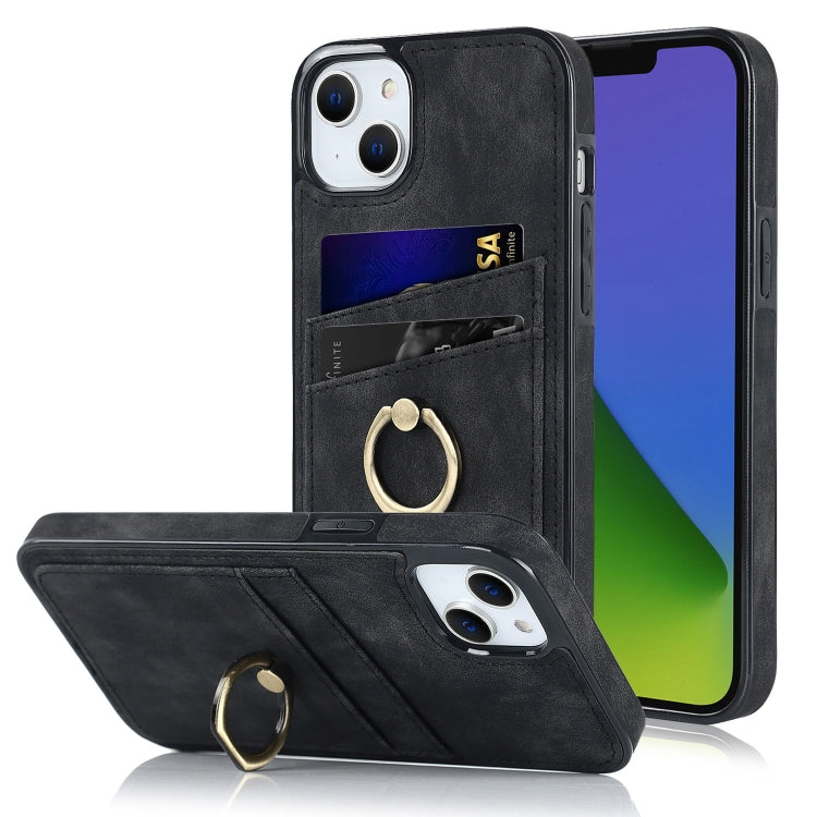 Funda de Teléfono iPhone 14 Cuero Parche Vintage Soporte para Anillo (Negro)