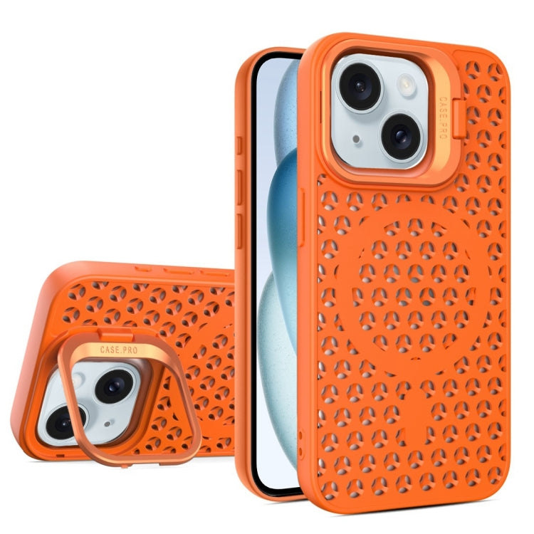 For iPhone 15 Plus Hollow Cooling Lens Holder MagSafe Magnetic TPU Phone Case (Orange)