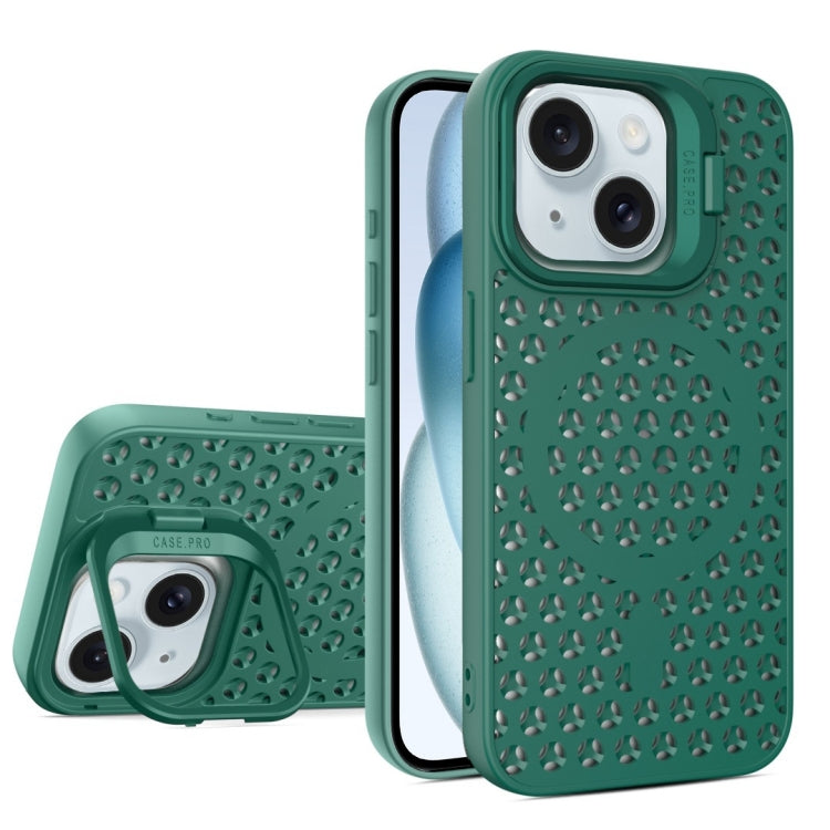 For iPhone 15 Plus Hollow Cooling Lens Holder MagSafe Magnetic TPU Phone Case (Green)